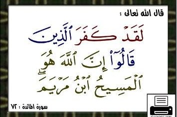 لَقَدْ كَفَرَ الَّذِينَ قَالُوا إِنَّ اللَّهَ هُوَ الْمَسِيحُ ابْنُ مَرْيَمَ وَقَالَ الْمَسِيحُ يَا بَنِي إِسْرَائِيلَ اعْبُدُوا اللَّهَ رَبِّي وَرَبَّكُمْ إِنَّهُ ُ مَنْ يُشْرِكْ بِاللَّهِ فَقَدْ حَرَّمَ اللَّهُ عَلَيْهِ الْجَنَّةَ وَمَأْوَاهُ النَّارُ وَمَا لِلظَّالِمِينَ مِنْ أَنْصَارٍ