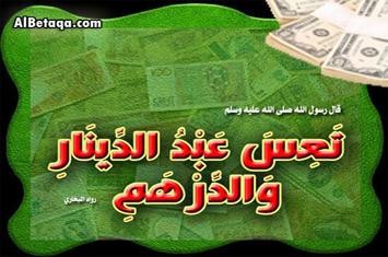 "Celakalah hamba dinar, hamba dirham, hamba khamishah (pakaian indah dari sutera); jika diberi ridha dan jika tidak diberi marah. Celaka dan tersungkurlah ia, ketika tertusuk duri semoga dia tidak bisa mencabutnya."
